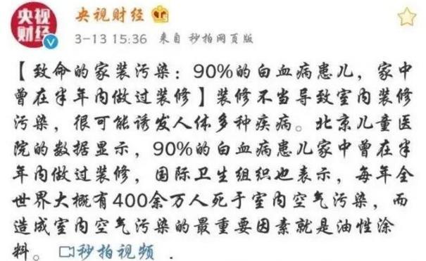 據(jù)央視報道,根據(jù)北京兒童醫(yī)院的數(shù)據(jù)顯示,90%的白血病患兒家中曾在半年內(nèi)做過裝修。事實上,人們每天平均有2/3的時間在室內(nèi)度過,室內(nèi)環(huán)境污染對兒童、孕婦的損害更為嚴重。在房子裝修過程中,地面、墻面裝飾材料是最大污染源之一。